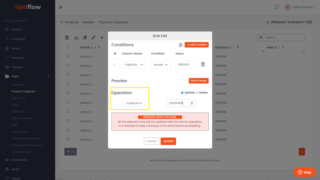 The bulk editing functionality allows users to make direct modifications to the table according to specific conditions.
