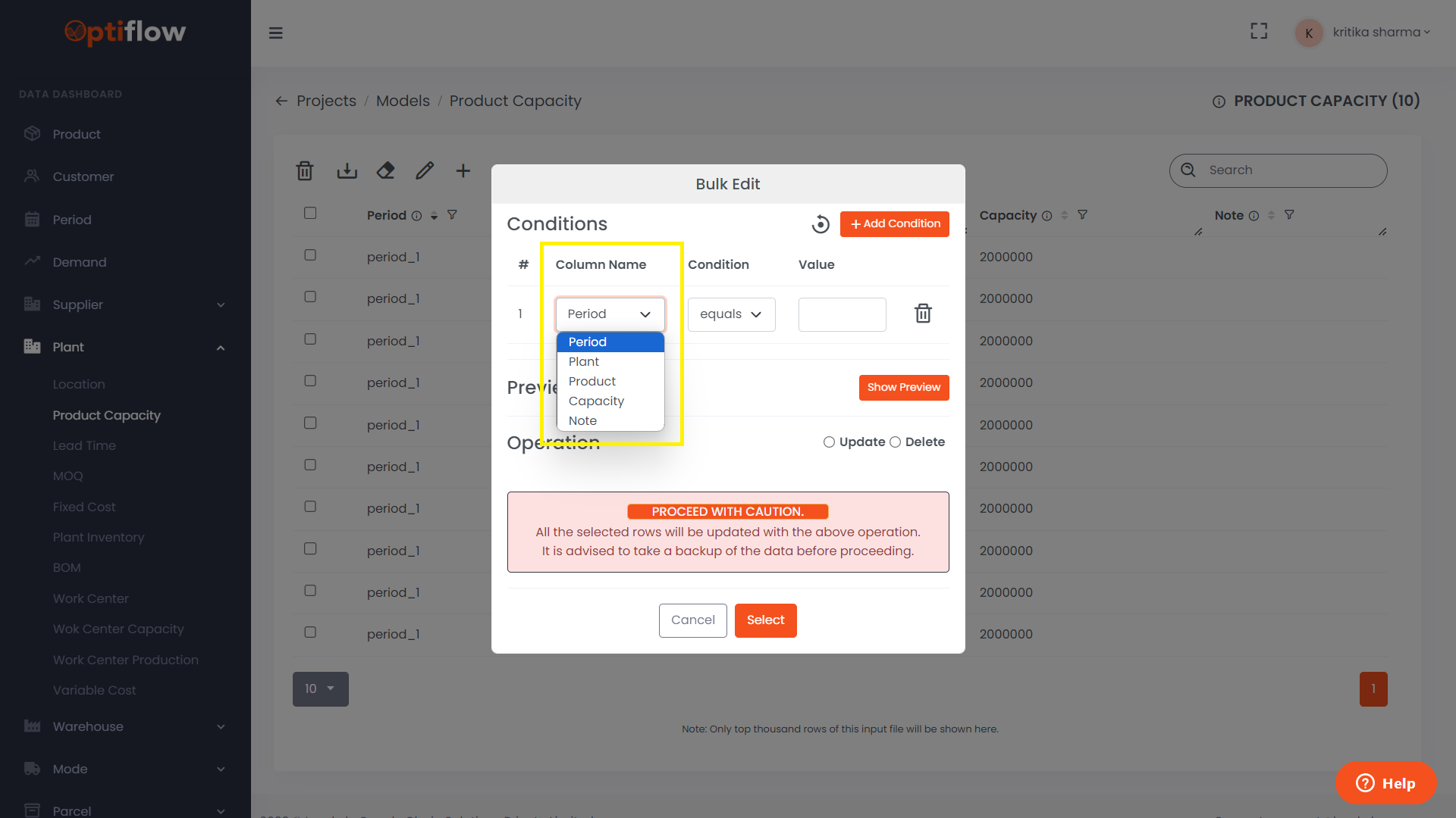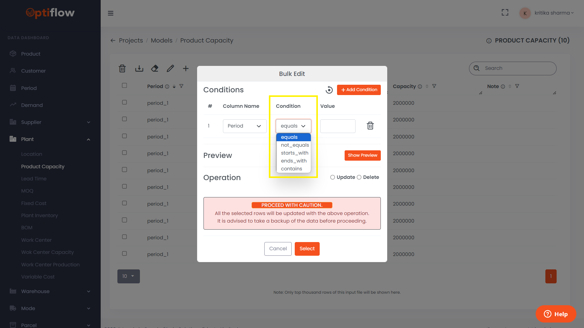 Select column name on which the condition is to be applied.
