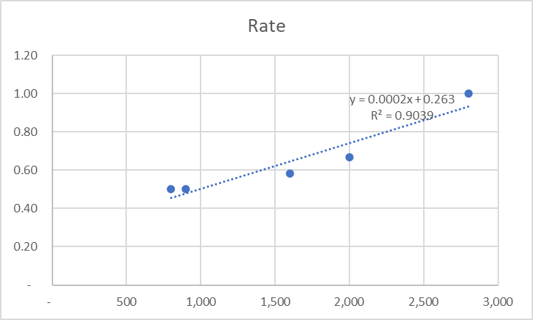 The regression curve has been established between Rate per unit weight and distance for the provided dataset, yielding values of M = 0.0002 and C = 0.263 as determined from the resultant equation.