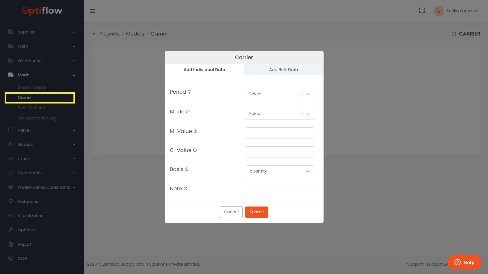 The mode can be specified, and utilizing the available data for that mode, we can generate a regression curve for the values of M (slope) and C (intercept). Basis field can be either “Weight” or “Quantity” depending upon whether we have taken rate per unit weight or quantity for generating regression curve.