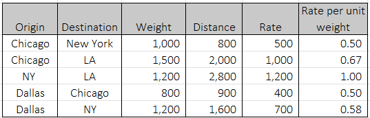 Example: We have this given dataset with Origin, Destination, Weight, Distance and Rate.