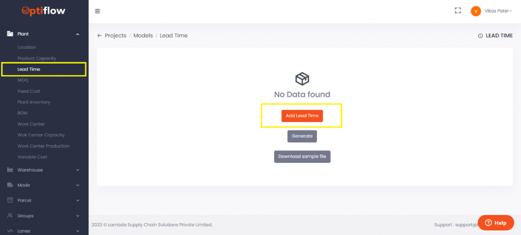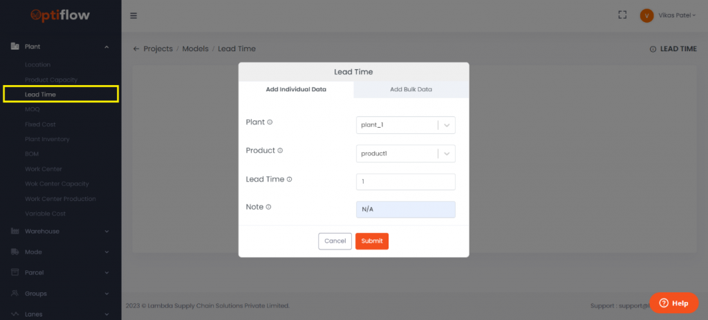 To add lead time, click on Lead Time under Plants and then by clicking on add lead time, you can add individual data or bulk data under respective tabs. Applicable only in multiperiod model.