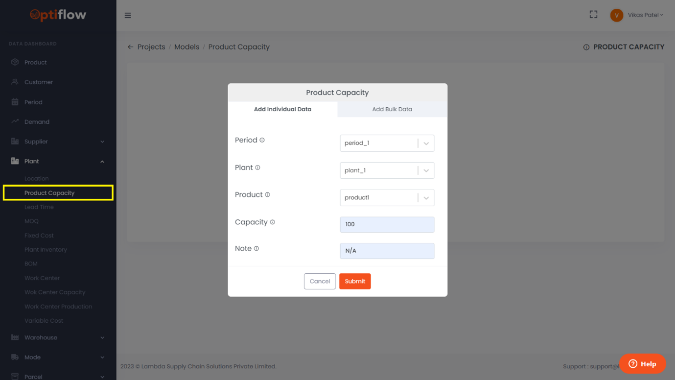 To add product capacity, click on Product Capacity under plant and then by clicking on add product capacity, you can add individual data or bulk data under respective tabs.