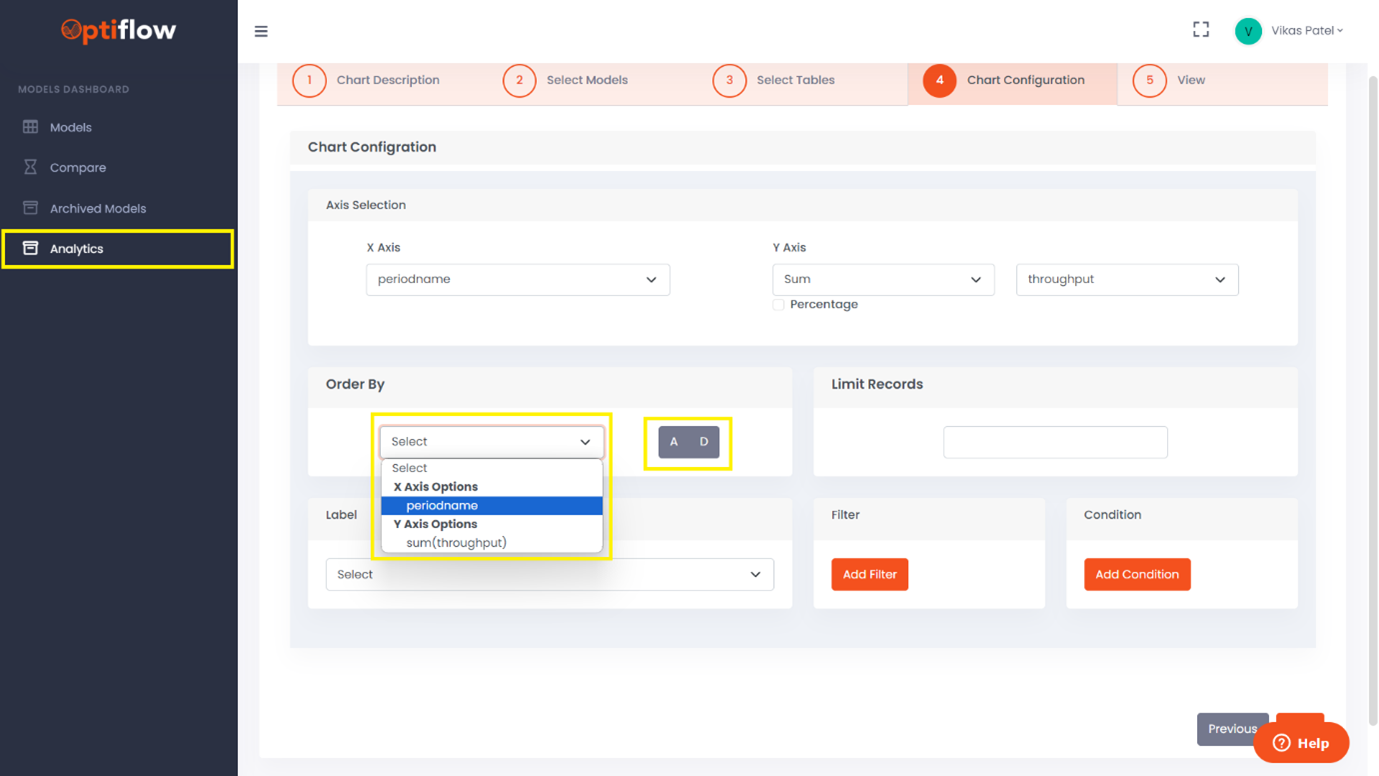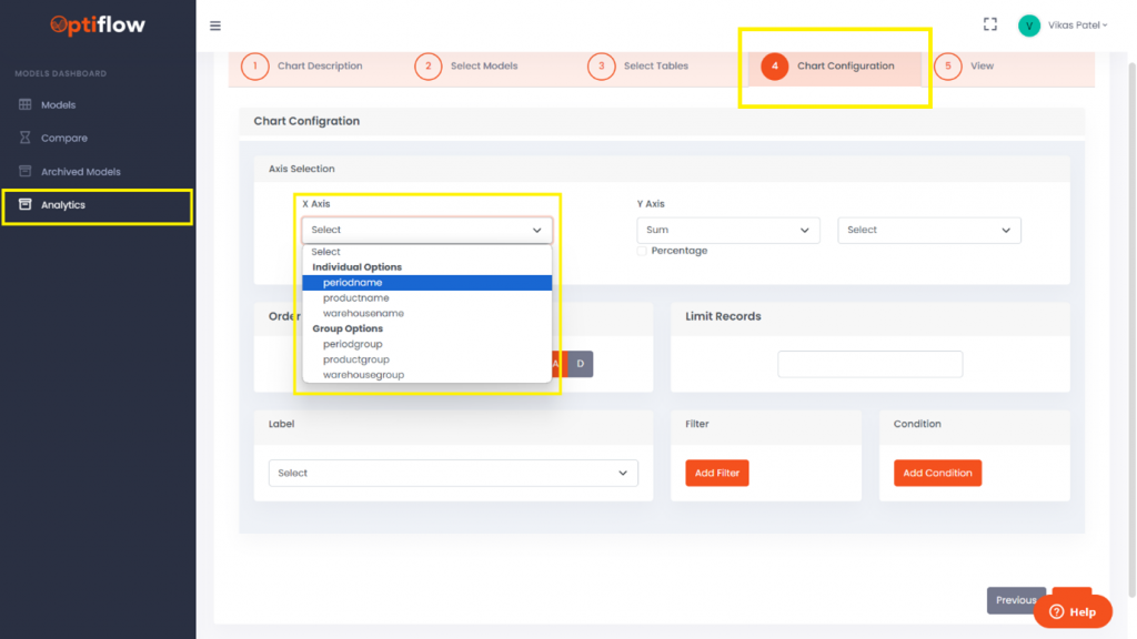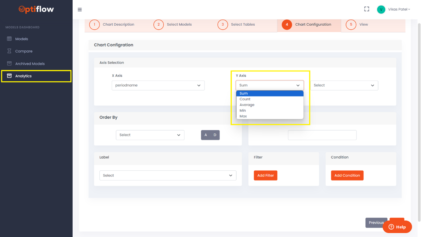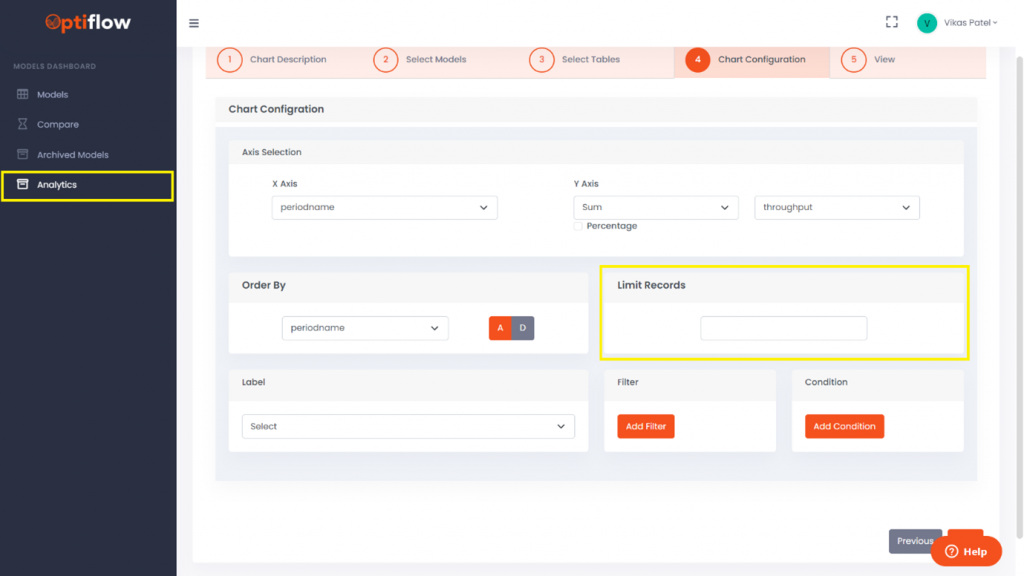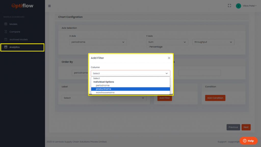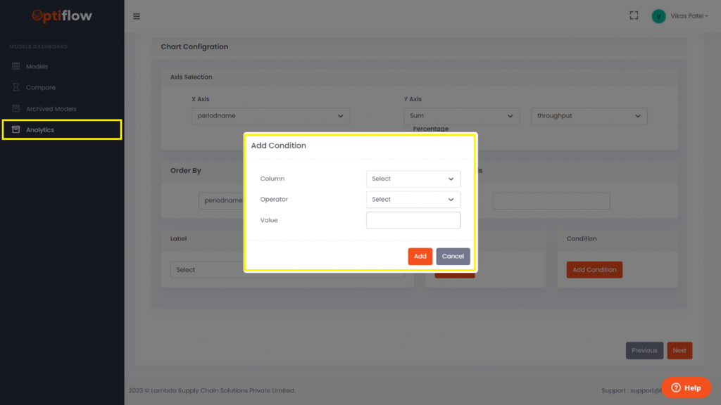 Incorporate conditions by selecting a column, choosing an operator, and specifying a value for charts if necessary. Then click on “Next”
