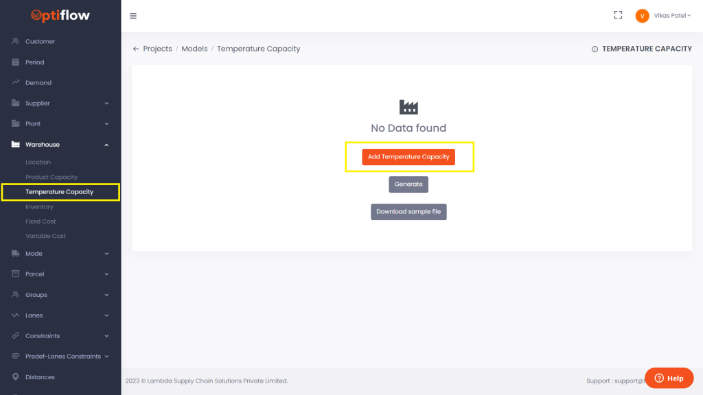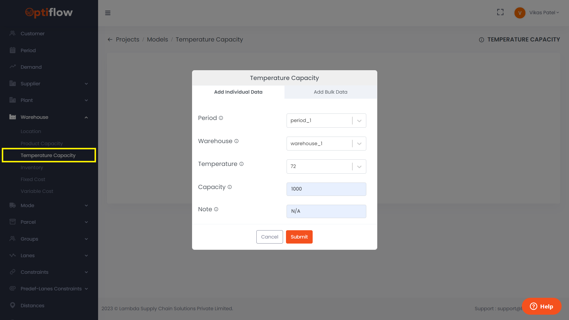 Click on Temperature Capacity under warehouses and then by clicking on add temperature capacity, you can add individual data or bulk data under respective tabs.
