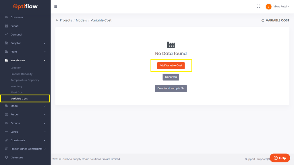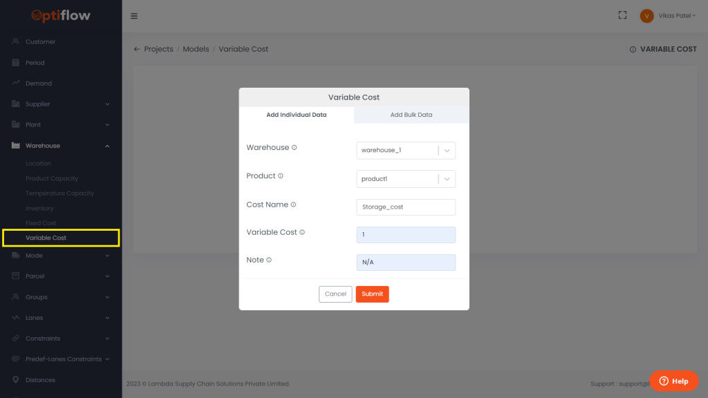 Click on Variable Cost under warehouses and then by clicking on add variable cost, you can add individual data or bulk data under respective tabs.