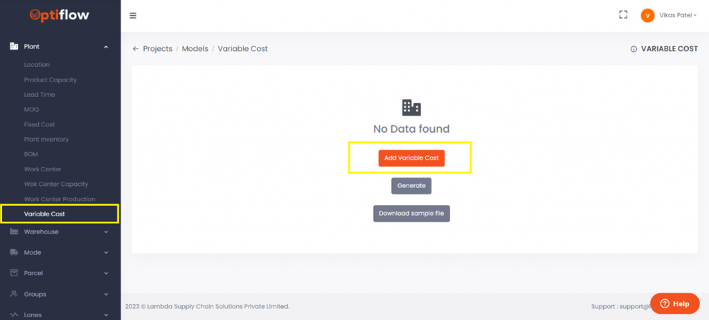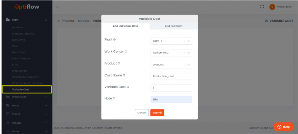 To add variable cost, click on Variable Cost under plants and then by clicking on add variable cost, you can add individual data or bulk data under respective tabs.