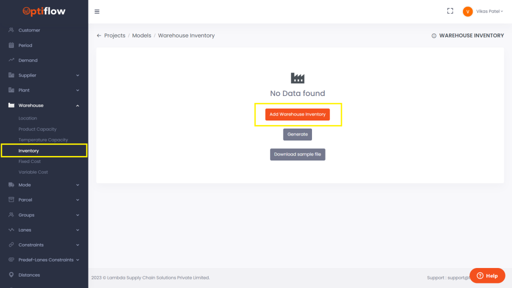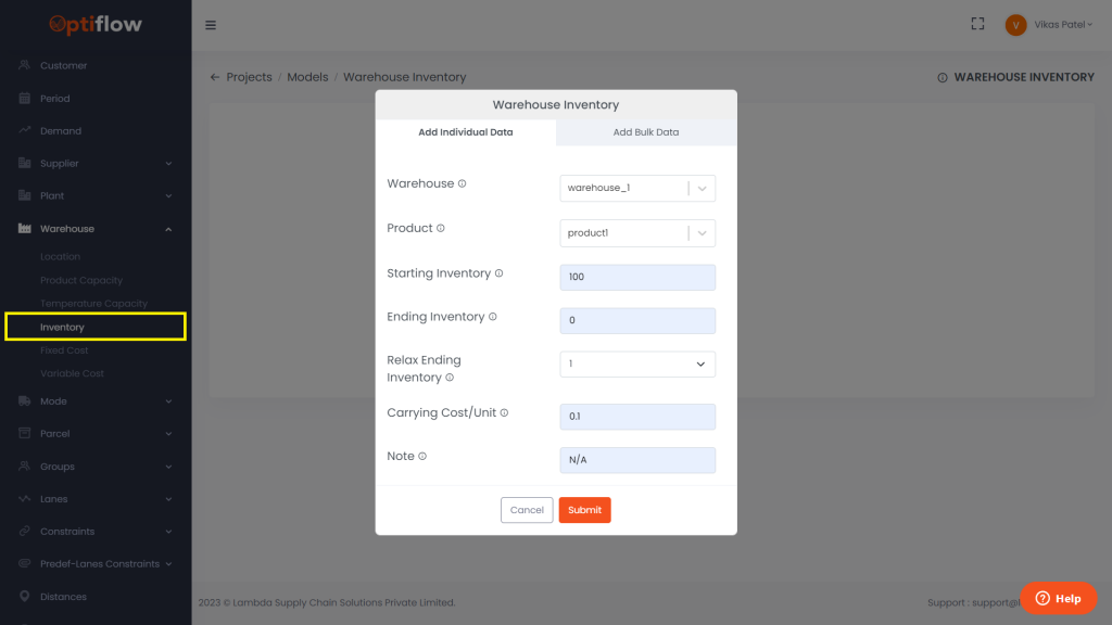 Click on Inventory under Warehouses and then by clicking on add warehouse inventory, you can add individual data or bulk data under respective tabs.