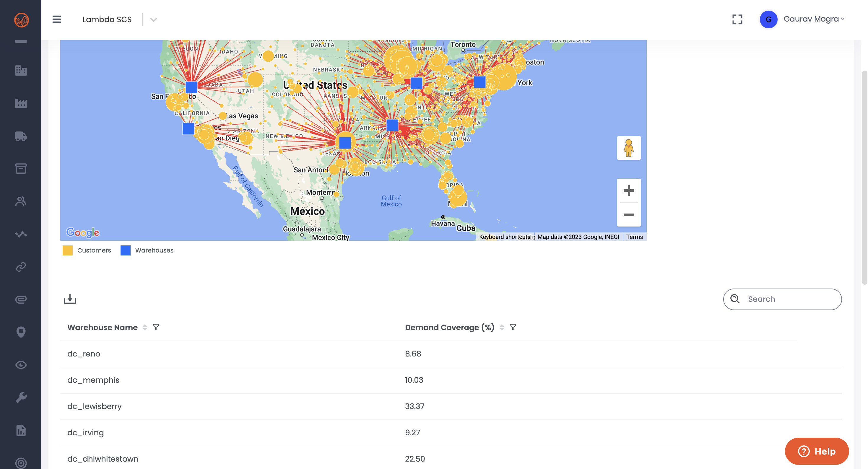 At times, supply chain design professionals like understand % demand that can be served using existing locations within ‘x’ number of miles. With Optiflow’s intelligent green field analysis, users can define coverage radius and assess extent of demand that can be served within the coverage radius